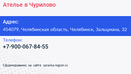Ателье в Чурилово по адресу 454079, Челябинская область, Челябинск, Зальцмана, 32 в дальнейшем Организация, размещена в следующих категориях: