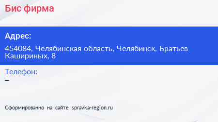 Бис, фирма по адресу 454084, Челябинская область, Челябинск, Братьев Кашириных, 8 в дальнейшем Организация, размещена в следующих категориях: