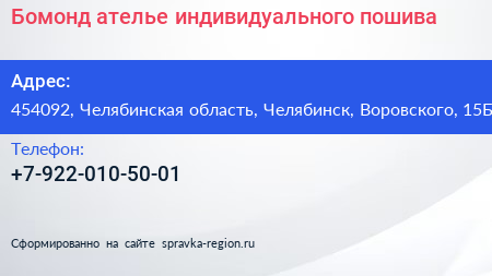 Бомонд, ателье индивидуального пошива по адресу 454092, Челябинская область, Челябинск, Воровского, 15Б в дальнейшем Организация, размещена в следующих категориях: