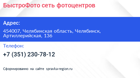 БыстроФото, сеть фотоцентров по адресу 454007, Челябинская область, Челябинск, Артиллерийская, 136 в дальнейшем Организация, размещена в следующих категориях: