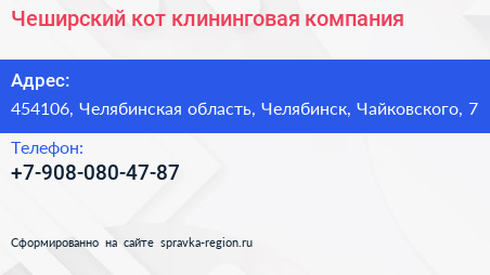 Чеширский кот, клининговая компания по адресу 454106, Челябинская область, Челябинск, Чайковского, 7 в дальнейшем Организация, размещена в следующих категориях: