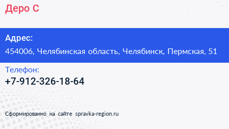 Деро-С по адресу 454006, Челябинская область, Челябинск, Пермская, 51 в дальнейшем Организация, размещена в следующих категориях:
