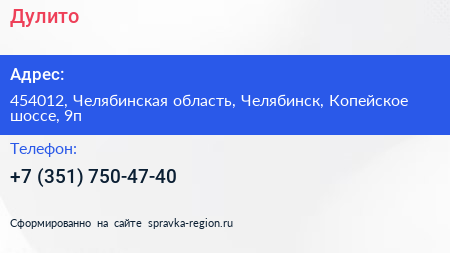 Дулито по адресу 454012, Челябинская область, Челябинск, Копейское шоссе, 9п в дальнейшем Организация, размещена в следующих категориях:
