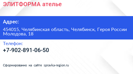 ЭЛИТФОРМА, ателье по адресу 454015, Челябинская область, Челябинск, Героя России Молодова, 18 в дальнейшем Организация, размещена в следующих категориях: