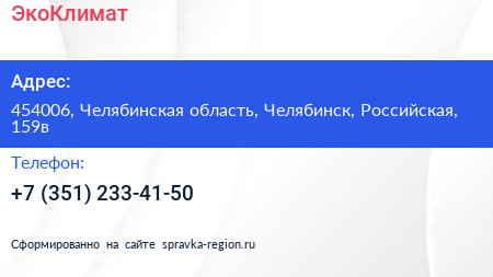 ЭкоКлимат по адресу 454006, Челябинская область, Челябинск, Российская, 159в в дальнейшем Организация, размещена в следующих категориях: