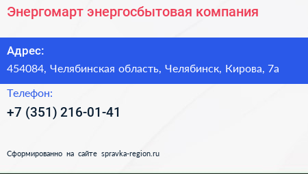 Энергомарт, энергосбытовая компания по адресу 454084, Челябинская область, Челябинск, Кирова, 7а в дальнейшем Организация, размещена в следующих категориях: