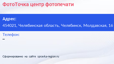 ФотоТочка, центр фотопечати по адресу 454021, Челябинская область, Челябинск, Молдавская, 16 в дальнейшем Организация, размещена в следующих категориях: