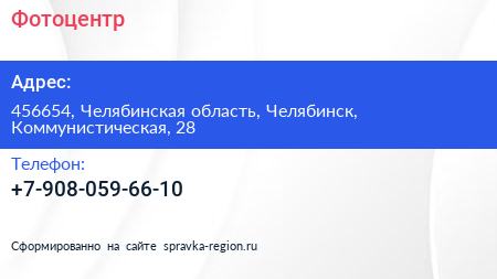 Фотоцентр по адресу 456654, Челябинская область, Челябинск, Коммунистическая, 28 в дальнейшем Организация, размещена в следующих категориях: