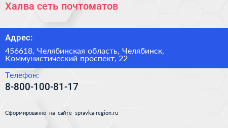 Халва, сеть почтоматов по адресу 456618, Челябинская область, Челябинск, Коммунистический проспект, 22 в дальнейшем Организация, размещена в следующих категориях: