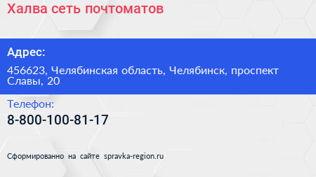 Халва, сеть почтоматов по адресу 456623, Челябинская область, Челябинск, проспект Славы, 20 в дальнейшем Организация, размещена в следующих категориях: