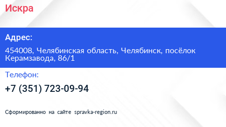 Искра по адресу 454008, Челябинская область, Челябинск, посёлок Керамзавода, 86/1 в дальнейшем Организация, размещена в следующих категориях: