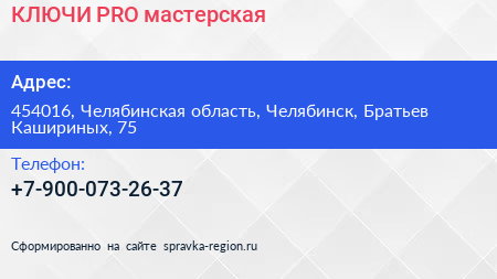 КЛЮЧИ PRO, мастерская по адресу 454016, Челябинская область, Челябинск, Братьев Кашириных, 75 в дальнейшем Организация, размещена в следующих категориях: