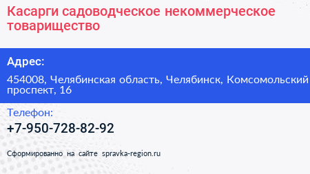 Касарги, садоводческое некоммерческое товарищество по адресу 454008, Челябинская область, Челябинск, Комсомольский проспект, 16 в дальнейшем Организация, размещена в следующих категориях: