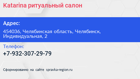 Katarina, ритуальный салон по адресу 454036, Челябинская область, Челябинск, Индивидуальная, 2 в дальнейшем Организация, размещена в следующих категориях: