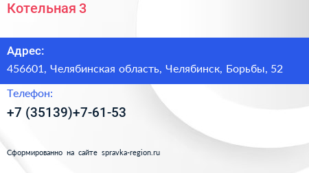 Котельная №3 по адресу 456601, Челябинская область, Челябинск, Борьбы, 52 в дальнейшем Организация, размещена в следующих категориях: