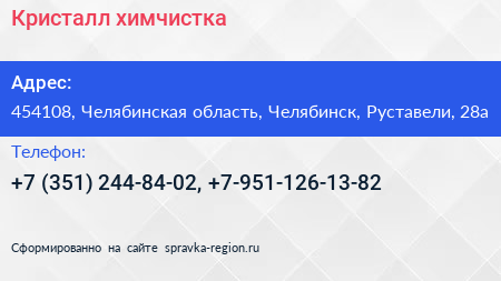 Кристалл, химчистка по адресу 454108, Челябинская область, Челябинск, Руставели, 28а в дальнейшем Организация, размещена в следующих категориях: