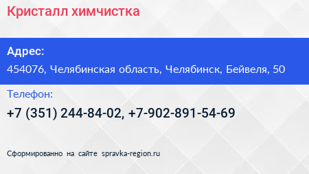Кристалл, химчистка по адресу 454076, Челябинская область, Челябинск, Бейвеля, 50 в дальнейшем Организация, размещена в следующих категориях: