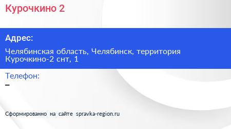 Курочкино 2 по адресу Челябинская область, Челябинск, территория Курочкино-2 снт, 1 в дальнейшем Организация, размещена в следующих категориях: