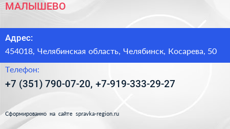 МАЛЫШЕВО по адресу 454018, Челябинская область, Челябинск, Косарева, 50 в дальнейшем Организация, размещена в следующих категориях: