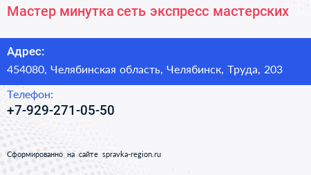 Мастер минутка, сеть экспресс-мастерских по адресу 454080, Челябинская область, Челябинск, Труда, 203 в дальнейшем Организация, размещена в следующих категориях: