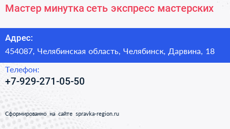 Мастер минутка, сеть экспресс-мастерских по адресу 454087, Челябинская область, Челябинск, Дарвина, 18 в дальнейшем Организация, размещена в следующих категориях: