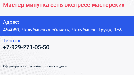 Мастер минутка, сеть экспресс-мастерских по адресу 454080, Челябинская область, Челябинск, Труда, 166 в дальнейшем Организация, размещена в следующих категориях: