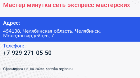 Мастер минутка, сеть экспресс-мастерских по адресу 454138, Челябинская область, Челябинск, Молодогвардейцев, 7 в дальнейшем Организация, размещена в следующих категориях: