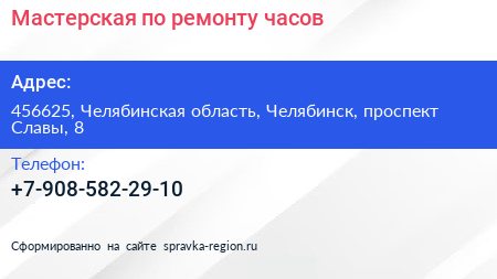 Мастерская по ремонту часов по адресу 456625, Челябинская область, Челябинск, проспект Славы, 8 в дальнейшем Организация, размещена в следующих категориях: