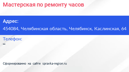 Мастерская по ремонту часов по адресу 454084, Челябинская область, Челябинск, Каслинская, 64 в дальнейшем Организация, размещена в следующих категориях: