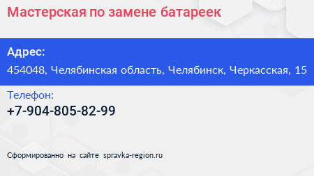 Мастерская по замене батареек по адресу 454048, Челябинская область, Челябинск, Черкасская, 15 в дальнейшем Организация, размещена в следующих категориях:
