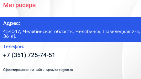 Метросерв по адресу 454047, Челябинская область, Челябинск, Павелецкая 2-я, 36 к1 в дальнейшем Организация, размещена в следующих категориях: