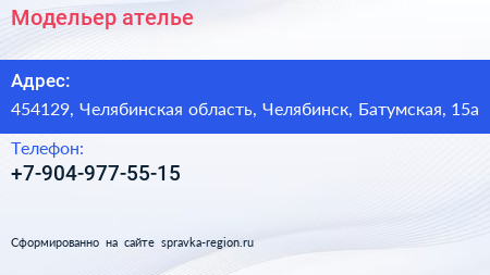 Модельер, ателье по адресу 454129, Челябинская область, Челябинск, Батумская, 15а в дальнейшем Организация, размещена в следующих категориях: