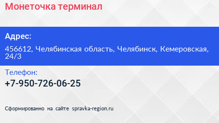 Монеточка, терминал по адресу 456612, Челябинская область, Челябинск, Кемеровская, 24/3 в дальнейшем Организация, размещена в следующих категориях: