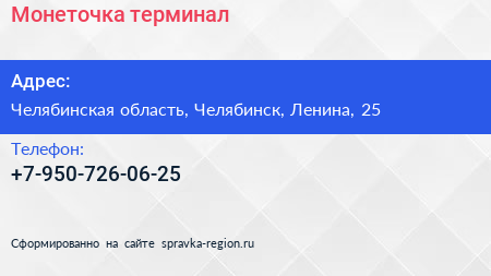 Монеточка, терминал по адресу Челябинская область, Челябинск, Ленина, 25 в дальнейшем Организация, размещена в следующих категориях: