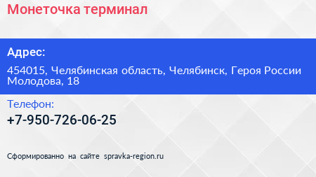 Монеточка, терминал по адресу 454015, Челябинская область, Челябинск, Героя России Молодова, 18 в дальнейшем Организация, размещена в следующих категориях: