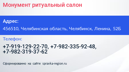 Монумент, ритуальный салон по адресу 456510, Челябинская область, Челябинск, Ленина, 52Б в дальнейшем Организация, размещена в следующих категориях:
