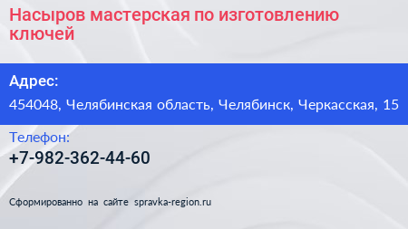 Насыров, мастерская по изготовлению ключей по адресу 454048, Челябинская область, Челябинск, Черкасская, 15 в дальнейшем Организация, размещена в следующих категориях: