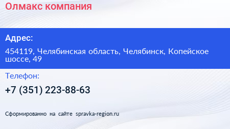 Олмакс, компания по адресу 454119, Челябинская область, Челябинск, Копейское шоссе, 49 в дальнейшем Организация, размещена в следующих категориях: