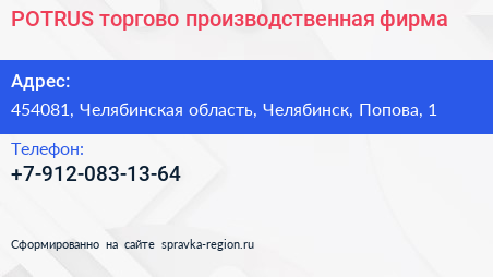 POTRUS, торгово-производственная фирма по адресу 454081, Челябинская область, Челябинск, Попова, 1 в дальнейшем Организация, размещена в следующих категориях:
