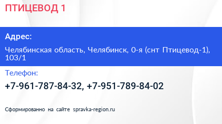 ПТИЦЕВОД-1 по адресу Челябинская область, Челябинск, 0-я (снт Птицевод-1), 103/1 в дальнейшем Организация, размещена в следующих категориях: