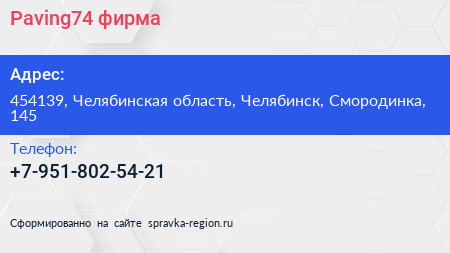 Paving74, фирма по адресу 454139, Челябинская область, Челябинск, Смородинка, 145 в дальнейшем Организация, размещена в следующих категориях: