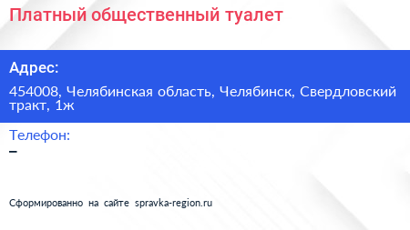 Платный общественный туалет по адресу 454008, Челябинская область, Челябинск, Свердловский тракт, 1ж в дальнейшем Организация, размещена в следующих категориях: