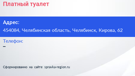 Платный туалет по адресу 454084, Челябинская область, Челябинск, Кирова, 62 в дальнейшем Организация, размещена в следующих категориях: