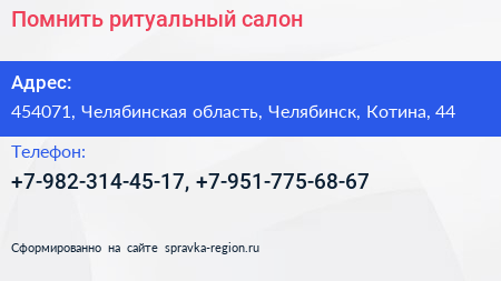 Помнить, ритуальный салон по адресу 454071, Челябинская область, Челябинск, Котина, 44 в дальнейшем Организация, размещена в следующих категориях:
