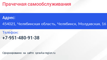 Прачечная самообслуживания по адресу 454021, Челябинская область, Челябинск, Молдавская, 16 в дальнейшем Организация, размещена в следующих категориях: