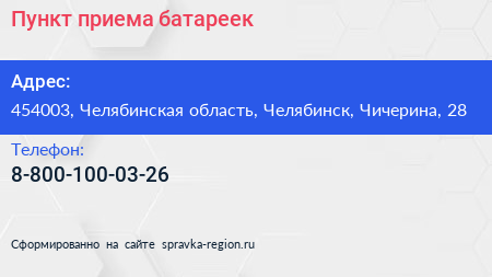 Пункт приема батареек по адресу 454003, Челябинская область, Челябинск, Чичерина, 28 в дальнейшем Организация, размещена в следующих категориях:
