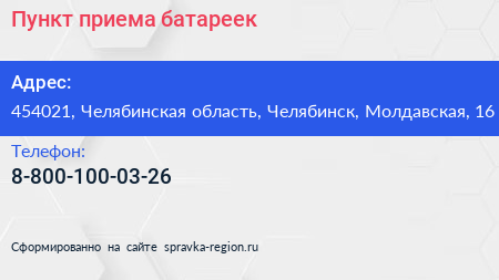 Пункт приема батареек по адресу 454021, Челябинская область, Челябинск, Молдавская, 16 в дальнейшем Организация, размещена в следующих категориях: