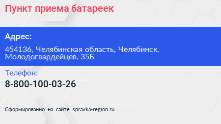 Пункт приема батареек по адресу 454136, Челябинская область, Челябинск, Молодогвардейцев, 35Б в дальнейшем Организация, размещена в следующих категориях: