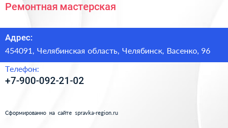 Ремонтная мастерская по адресу 454091, Челябинская область, Челябинск, Васенко, 96 в дальнейшем Организация, размещена в следующих категориях: