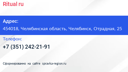 Ritual.ru по адресу 454018, Челябинская область, Челябинск, Отрадная, 25 в дальнейшем Организация, размещена в следующих категориях: